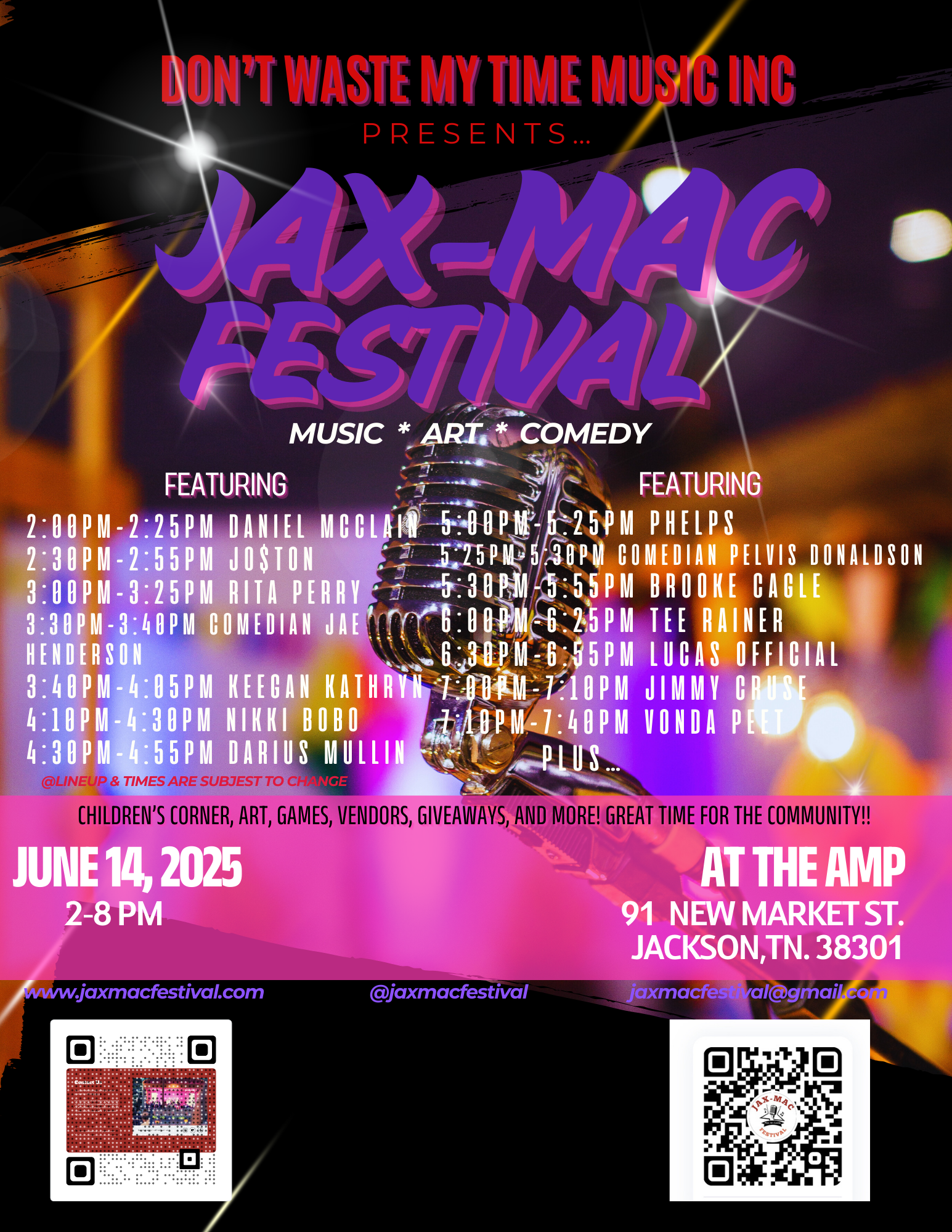 PHELPS , LYRICK IVY ,RITA PERRY , DARIUS MULLIN , JOSTON , PLUS.. JOSTON ,BROOKE ,CAGLE DANIEL MCCLAIN ,TEE RAINER ,MASON LUCAS,KEEGAN KATHRYN ,VODA PEET 2025 JAX-MAC FESTIVAL MUSIC ART COMEDYJUNE 14TH 2025 SATURDAY 2 PM – 8 PM FREE ADMISSION KIDS ACTIVITIES VENDORS FOOD TRUCKS PRIZES & MUCH MORE “VIEWPOINTS EXPRESSED BY PROMOTERS, SPONSORS